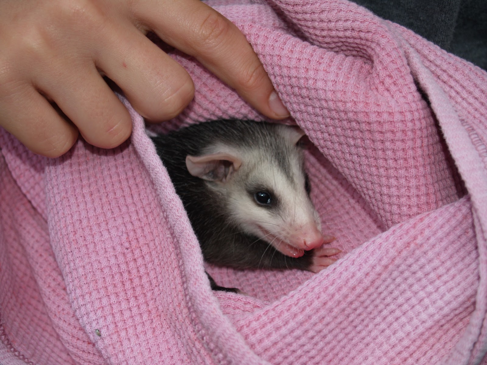 Possums are interesting, being the only North American marsupial and all, but honestly, I have never really thought of them as cute. Baby possums, though, are a whole different story. This little joey was just beautiful, and thankfully, uninjured. He was very shy, burrowing his head into the blanket so he didn't have to see our ugly mugs peering at him. Adult possums will hiss when threatened, but this guy was too young; he was completely silent. At his most menacing, he simply opened his mouth and showed his tiny possum teeth. Aww.
